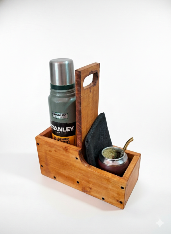 Es el accesorio ideal para organizar tus mateadas con estilo y comodidad. Hecha a mano con madera de alta calidad, combina un diseño rústico con la practicidad que necesitás para llevar el mate a todos lados.